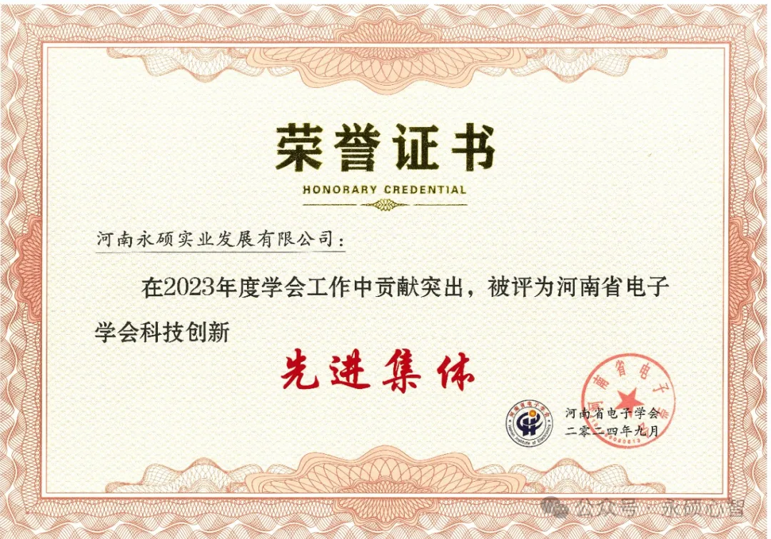 为不断提升激励电子信息企业的创新发展,河南省电子学会下发了《关于开展 2023 年度河南省电子信息科技创新先进集体和先进工作者评选工作的通知》,经材料初审、专家评审等环节,对在电子信息行业新技术、新科技、新成果方面有突出成绩与贡献的单位、专家和工作者分别给予了表彰。我公司被评为“2023年度河南省电子学会科技创新先进集体”。