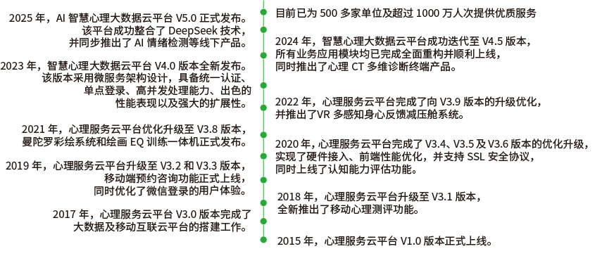 全网络应用,免安装、免维护;采用云测评、云计算、云储存、云备份的云数据安全规范,满足不低于100万人在线测评,大数据分析自动更新常模;高效实现异常心理筛查、心理危机即时预警、心理档案和社会全员心理健康水平报告一键生成。