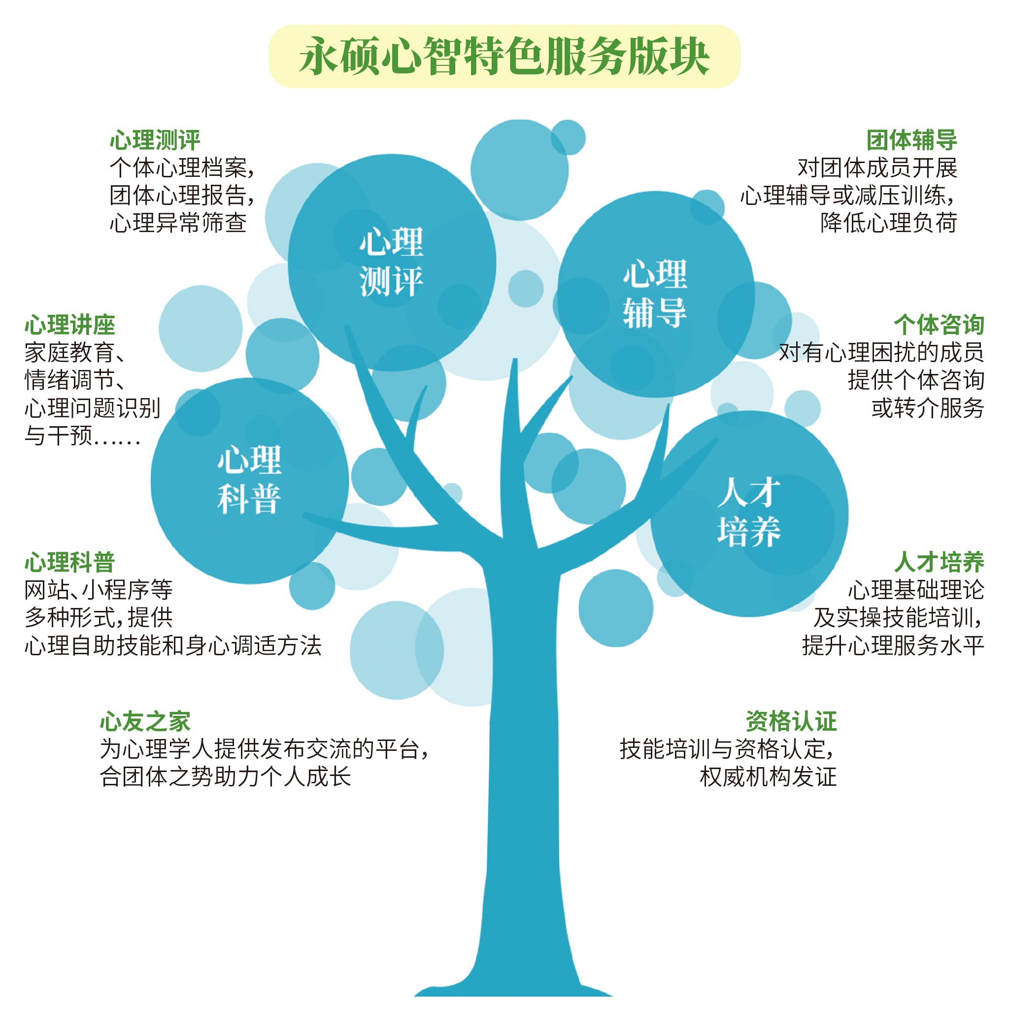 永硕心智咨询服务中心,作为永硕公司下属分支机构,汇聚公司多年行业经验、人才资源,依托自主研发的心理服务云平台,面向学校、企事业单位提供心理健康服务综合解决方案,致力于做将心理学真正落地的服务。